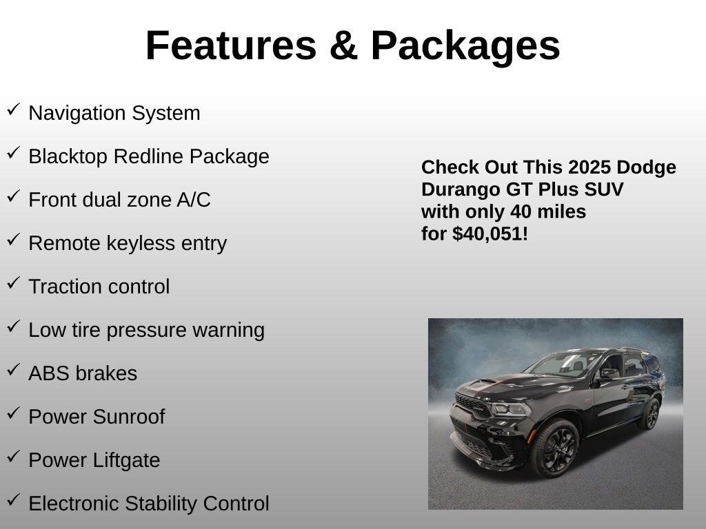 AWD, ABS brakes, Alloy wheels, Black Roof Rails, Blacktop Leather SRT Performance Seats, Blacktop Redline Package, Compass, Crypto Sweep Etch Accents, Electronic Stability Control, Floor Console w/Leather Armrest, Front dual zone A/C, Gloss Black Badges, Gloss Black Exterior Mirrors, GT Decal w/Red Tracer, Heated door mirrors, Heated front seats, Illuminated entry, Integrated Roof Rail Crossbars, Low tire pressure warning, Navigation System, ParkView Rear Back-Up Camera, Performance Hood, Power Liftgate, Power Sunroof, Premium Door Trim Panel, Premium Instrument Panel, Remote keyless entry, Satin Black Dodge Tail Lamp Badge, Traction control, Wheels: 20 x 8.0 Black Noise Aluminum. Odometer is 22977 miles below market average! Clean CARFAX.** OIL CHANGES FOR LIFE!! With purchase or lease of your New, Pre-Owned or Certified Pre-Owned Buick GMC purchased or leased from Performance GMC Buick; to be done with dealer recommended services, must be done at Performance GMC Buick Service Center only. Not available on prior sales; not available on Diesels, SVTs, Performance or Commercial vehicles. **DB Black Clearcoat 2025 Dodge Durango BLACKTOP REDLINE AWD 8-Speed Automatic 3.6L V6 24V VVTDon't wait until it is too late! Call today to schedule an appointment. REST ASSURED every vehicle at Performance Buick GMC has been hand selected by our Owner & Management. Each vehicle is put through a multi-point inspection by our factory certified technicians. After your future vehicle leaves our certified shop, it is fully detailed in our centralized recon shop and delivered just like new. With the Performance Auto Group - You CAN buy with confidence! We would love the opportunity to earn your business ASK US ABOUT OUR OIL CHANGES FOR LIFE! *All prices includes all costs to be paid by a consumer, except for licensing costs, registration fees and taxes. Vehicles are subject to prior sale. Price quotes subject to change based on current incentives on day of sale.