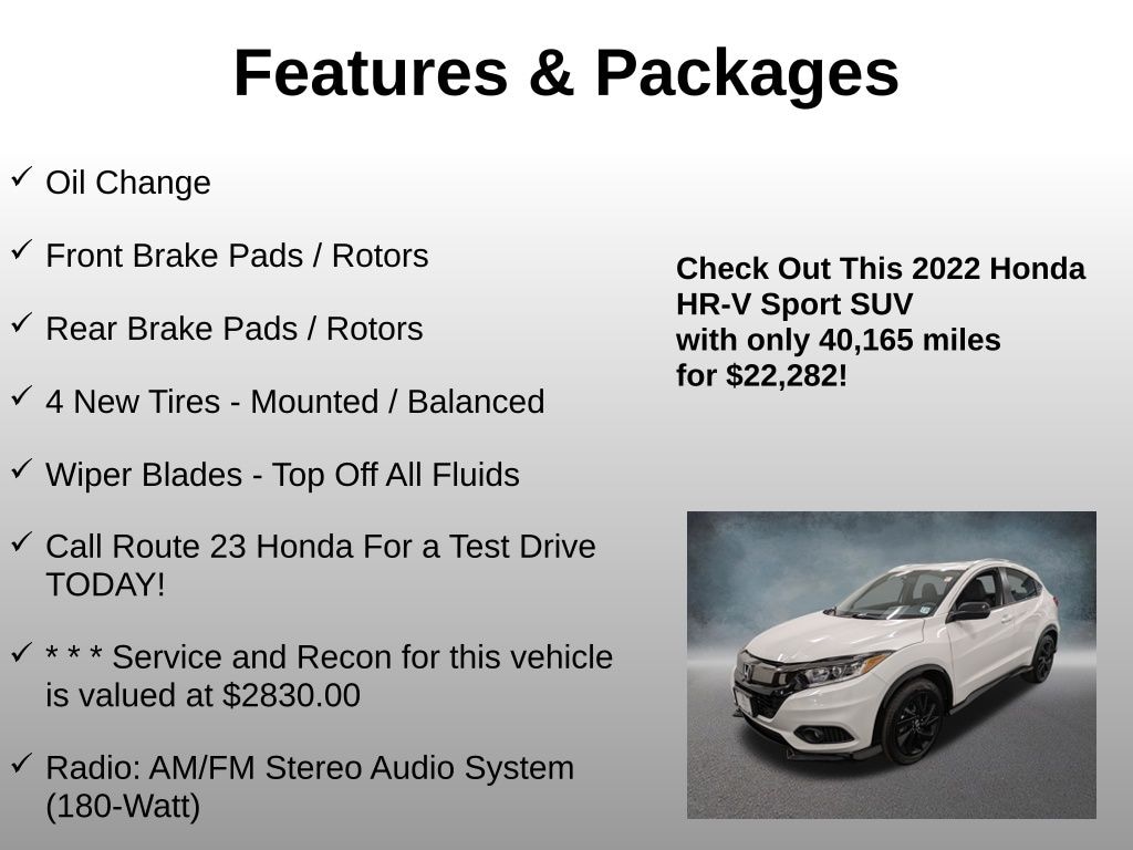 Oil Change, Front Brake Pads / Rotors, Rear Brake Pads / Rotors, 4 New Tires - Mounted / Balanced, Wiper Blades - Top Off All Fluids, Call Route 23 Honda For a Test Drive TODAY!, * * * Service and Recon for this vehicle is valued at $2830.00, 4 Speakers, 4-Wheel Disc Brakes, 5.436 Axle Ratio, ABS brakes, Air Conditioning, Alloy wheels, AM/FM radio, Apple CarPlay/Android Auto, Brake assist, Bumpers: body-color, Cloth Seat Trim, Driver door bin, Driver vanity mirror, Dual front impact airbags, Dual front side impact airbags, Electronic Stability Control, Emergency communication system: HondaLink, Exterior Parking Camera Rear, Front anti-roll bar, Front Bucket Seats, Front Center Armrest, Front fog lights, Front reading lights, Front wheel independent suspension, Fully automatic headlights, Illuminated entry, Low tire pressure warning, Occupant sensing airbag, Outside temperature display, Overhead airbag, Panic alarm, Passenger door bin, Passenger vanity mirror, Power door mirrors, Power steering, Power windows, Radio data system, Radio: AM/FM Stereo Audio System (180-Watt), Rear anti-roll bar, Rear window defroster, Rear window wiper, Remote keyless entry, Roof rack: rails only, Security system, Speed control, Speed-sensing steering, Split folding rear seat, Spoiler, Steering wheel mounted audio controls, Tachometer, Telescoping steering wheel, Tilt steering wheel, Traction control, Trip computer, Wheels: 18" Matte-Black Alloy. Odometer is 3108 miles below market average! Clean CARFAX. CARFAX One-Owner.