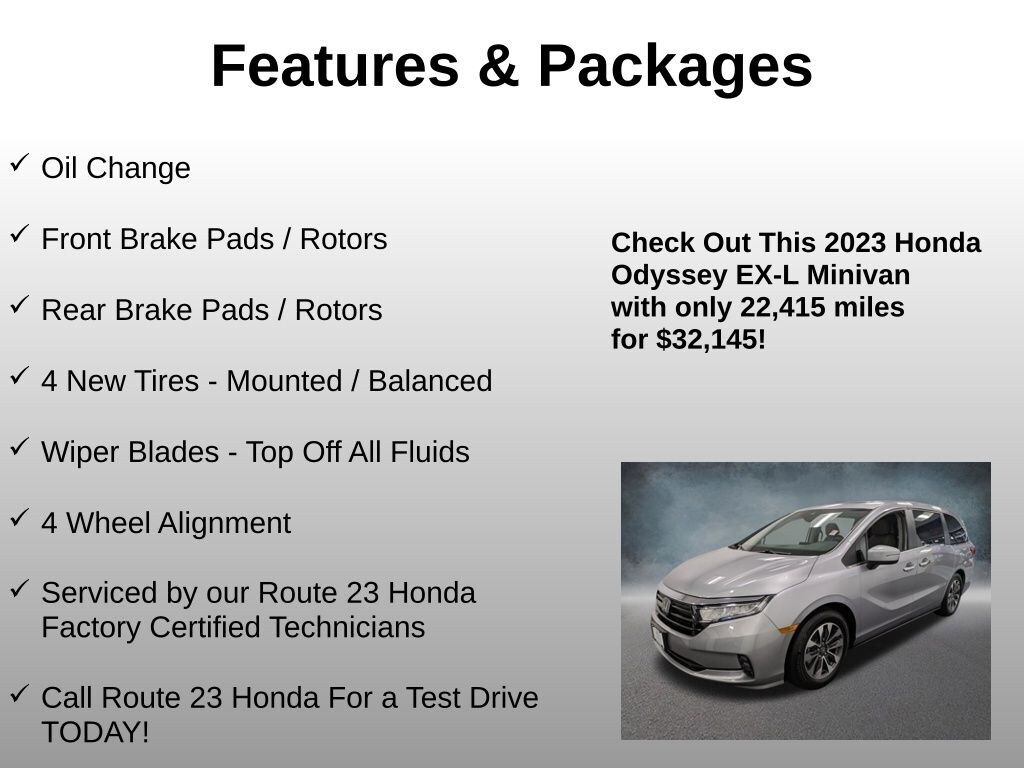 ** OIL CHANGES FOR LIFE!! With purchase or lease of your New, Pre-Owned or Certified Pre-Owned Honda purchased or leased from Route 23 Honda; to be done with dealer recommended services, must be done at Route 23 Honda Service Center only. Not available on prior sales; not available on Diesels, SVTs, Performance or Commercial vehicles. **