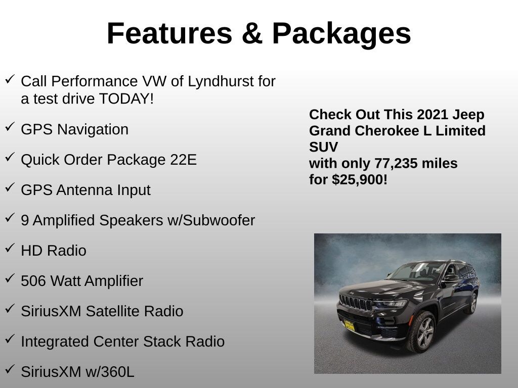 Whether you're embarking on a family road trip, tackling off-road adventures, or simply seeking a sophisticated daily driver, the 2021 Jeep Grand Cherokee L Limited is the perfect choice. Experience the perfect blend of capability, comfort, and technology by scheduling a test drive at Performance VW of Lyndhurst today. We're confident this remarkable SUV will exceed your expectations and become an integral part of your lifestyle.