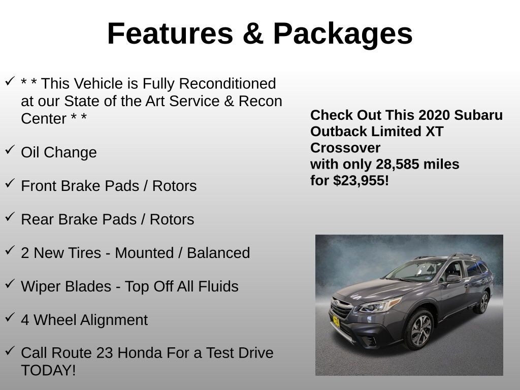 * * This Vehicle is Fully Reconditioned at our State of the Art Service & Recon Center * *, Oil Change, Front Brake Pads / Rotors, Rear Brake Pads / Rotors, 2 New Tires - Mounted / Balanced, Wiper Blades - Top Off All Fluids, 4 Wheel Alignment, Call Route 23 Honda For a Test Drive TODAY!, * * * Service and Recon for this vehicle is valued at $2290.00* * *, 12 Speakers, 4-Wheel Disc Brakes, 4.111 Axle Ratio, ABS brakes, Air Conditioning, All-Weather Floor Liners, Alloy wheels, AM/FM radio: SiriusXM, Auto High-beam Headlights, Auto-Dimming Exterior Mirror w/Approach Light, Auto-dimming Rear-View mirror, Automatic temperature control, Brake assist, Bumpers: body-color, Compass, Dome Light LED Upgrade, Driver door bin, Driver vanity mirror, Dual front impact airbags, Dual front side impact airbags, Electronic Stability Control, Emergency communication system: STARLINK Safety and Security (Subscription Required), Exterior Parking Camera Rear, Four wheel independent suspension, Front anti-roll bar, Front Bucket Seats, Front Center Armrest w/Storage, Front dual zone A/C, Front fog lights, Front reading lights, Fully automatic headlights, Garage door transmitter: HomeLink, harman/kardon Surround Sound Speaker System, harman/kardon® Speakers, Heated door mirrors, Heated Front Bucket Seats w/Memory, Heated front seats, Heated rear seats, Heated steering wheel, HVAC memory, Illuminated entry, Knee airbag, Low tire pressure warning, Memory seat, Navigation System, Occupant sensing airbag, Outside temperature display, Overhead airbag, Overhead console, Panic alarm, Passenger door bin, Passenger vanity mirror, Perforated Leather-Trimmed Upholstery, Power door mirrors, Power driver seat, Power Liftgate, Power moonroof, Power passenger seat, Power steering, Power windows, Radio: Subaru STARLINK 11.6" Multimedia Nav System, Rear anti-roll bar, Rear seat center armrest, Rear window defroster, Rear window wiper, Remote keyless entry, Roof rack, Security system, Speed control, Speed-sensing steering, Splash Guards, Split folding rear seat, Spoiler, Standard Model, STARLINK/Apple CarPlay/Android Auto, Steering wheel mounted audio controls, Steering Wheel Paddle Shift Control Switches, Tachometer, Telescoping steering wheel, Tilt steering wheel, Traction control, Trip computer, Turn signal indicator mirrors, Variably intermittent wipers, Wheels: 18" x 7J Black Aluminum Alloy. Odometer is 30813 miles below market average! Clean CARFAX. CARFAX One-Owner.